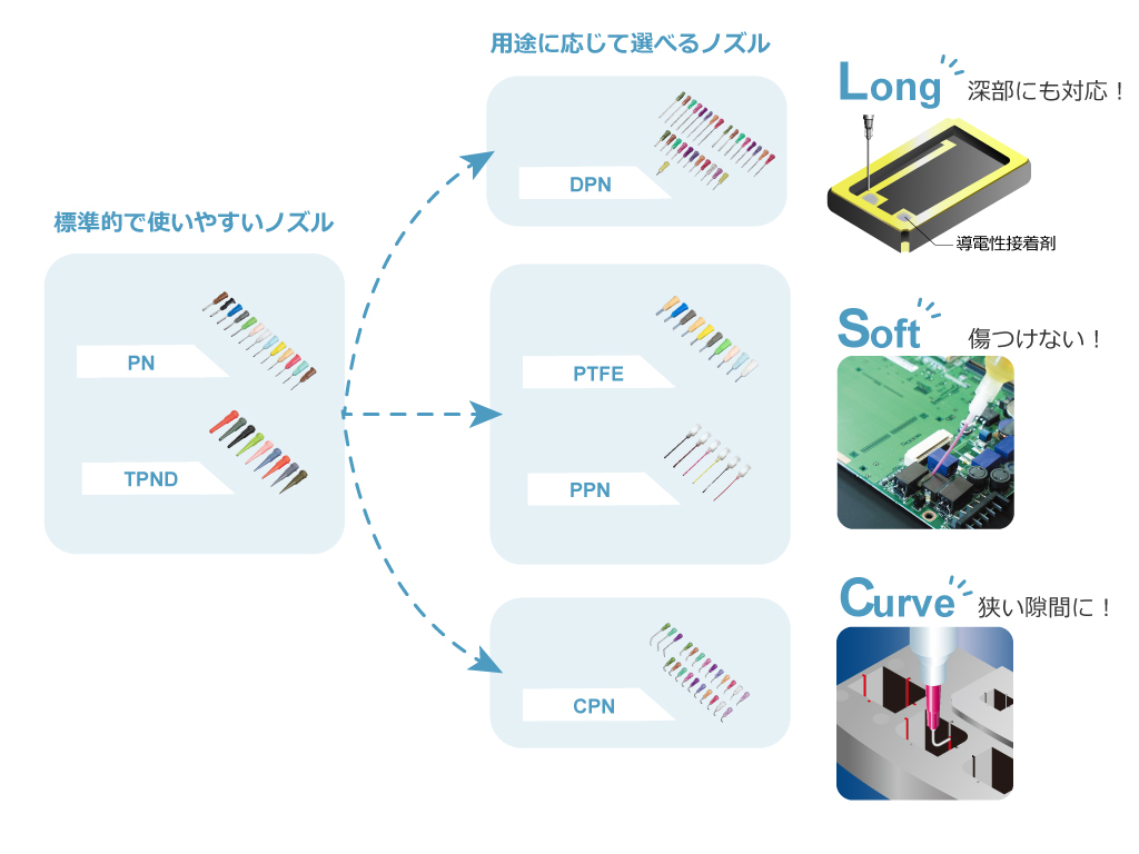 根據工作的形狀,選定的重點是能否訪問針頭想塗的地方。例如,使用錐形的話,粗部分干涉的話,會使用直接形狀的針頭,或者使用針尖長的產品。根據工作性的不同,也有不易傷害工作的樹脂製針頭適合的情況。可以侵入狹窄區域,彎曲的針頭也有陣容。