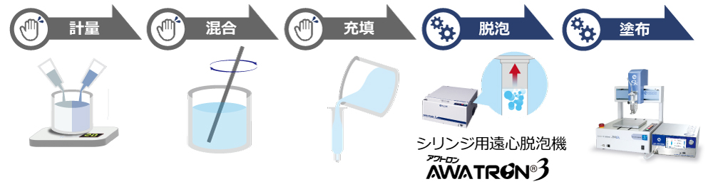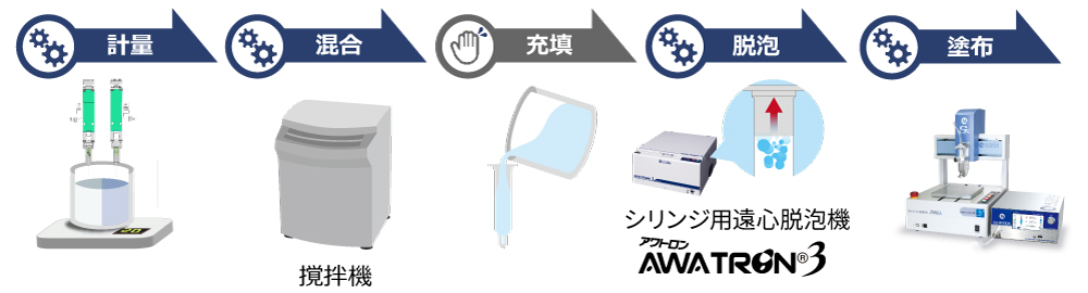 在進行2液混合和塗抹的工序中,除了上述的點膠機·攪拌機之外,還需要罐、秤量器、脫泡器等各種各樣的選項。