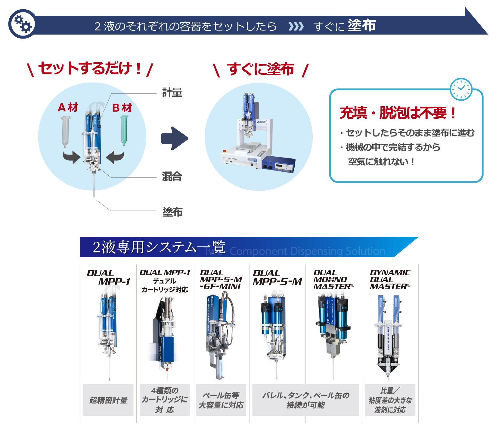 該裝置也被稱為“2液型點膠機”、“2液混合型吐出裝置”,是將成分不同的2個液體精密混合後吐出的裝置。擁有用於維持均勻混合比率的先進機構,在製造現場實現高效塗敷工作。2液混合點膠機在要求塗抹精度的製造業中發揮著不可或缺的作用。