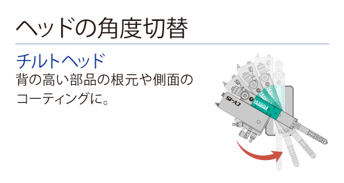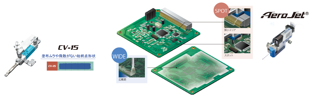 本公司的噴氣式飛機方式點膠機“AeroJet”可以很好地吐出液體,從噴嘴前端飛翔。另外,用於基板塗層的5mm到30mm以上的長針頭也有陣容,在點膠機和安裝部件容易干涉的狹窄區域也可以進行塗抹。