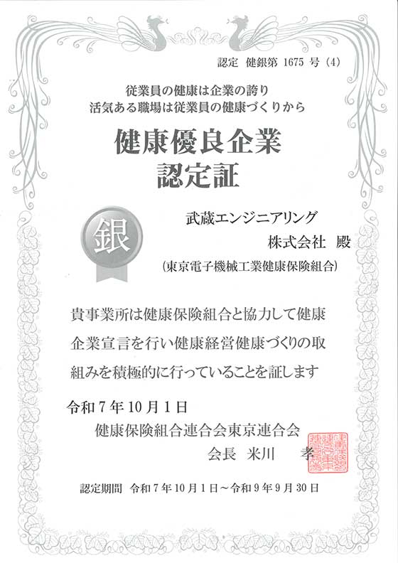 被認定為東京電子健保組合的健康優良企業 2025/11/19 通知 Tweet 本公司作為致力於職場健康建設、環境整備等的企業,東京電子機械工業保險組合認定為“健康優良企業”。該認定是根據“健康企業宣言”,全企業致力於健康建設,這是對通過這一舉措取得一定成果的企業給予的。本公司這次取得的成果得到了認可,作為“健康優良企業”接受了第四次認定更新。(參考:東京電子健保組合HP)今後,我們也將推進員工安心工作的環境建設,致力於進一步的健康管理。 Tweet